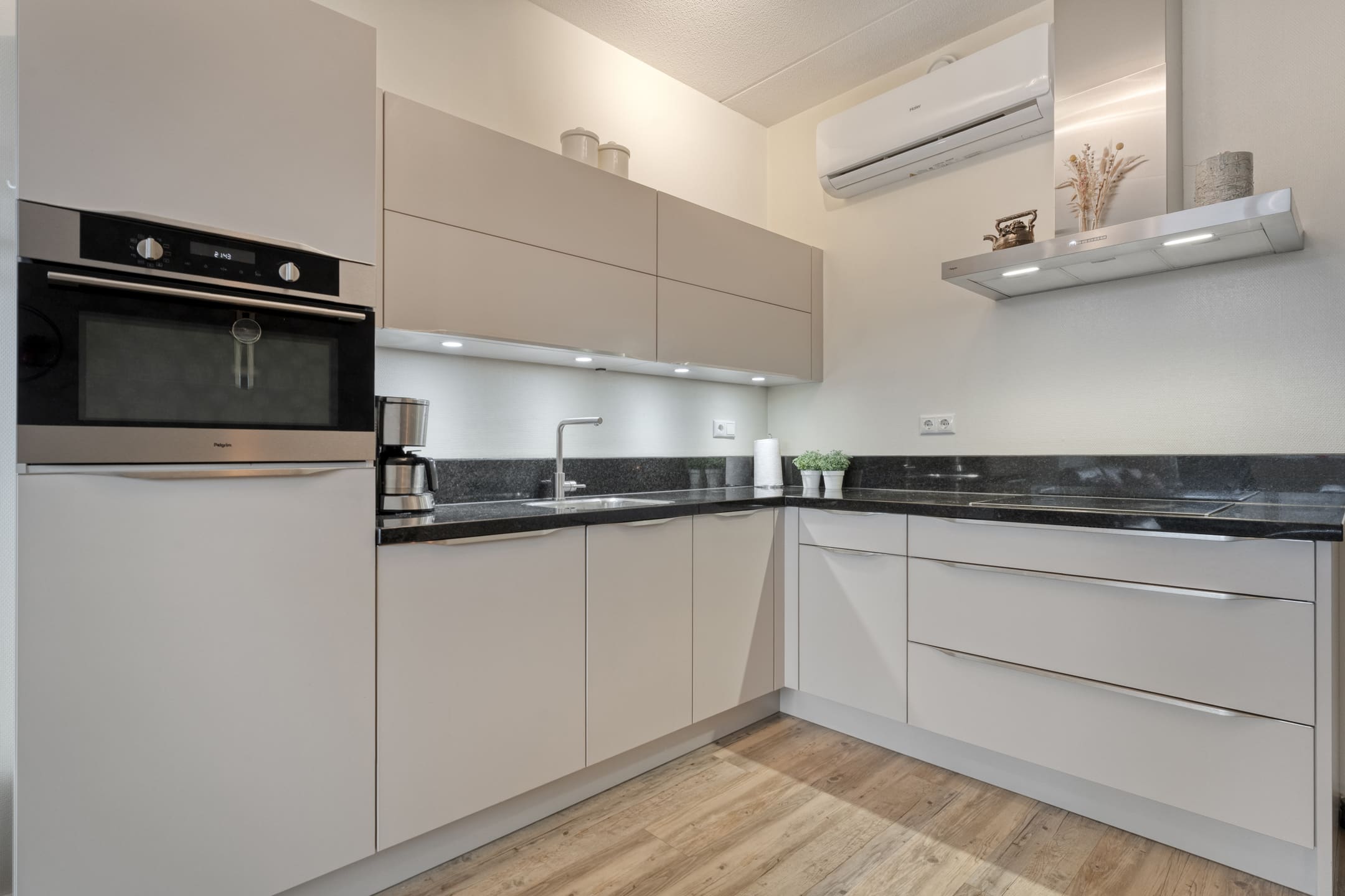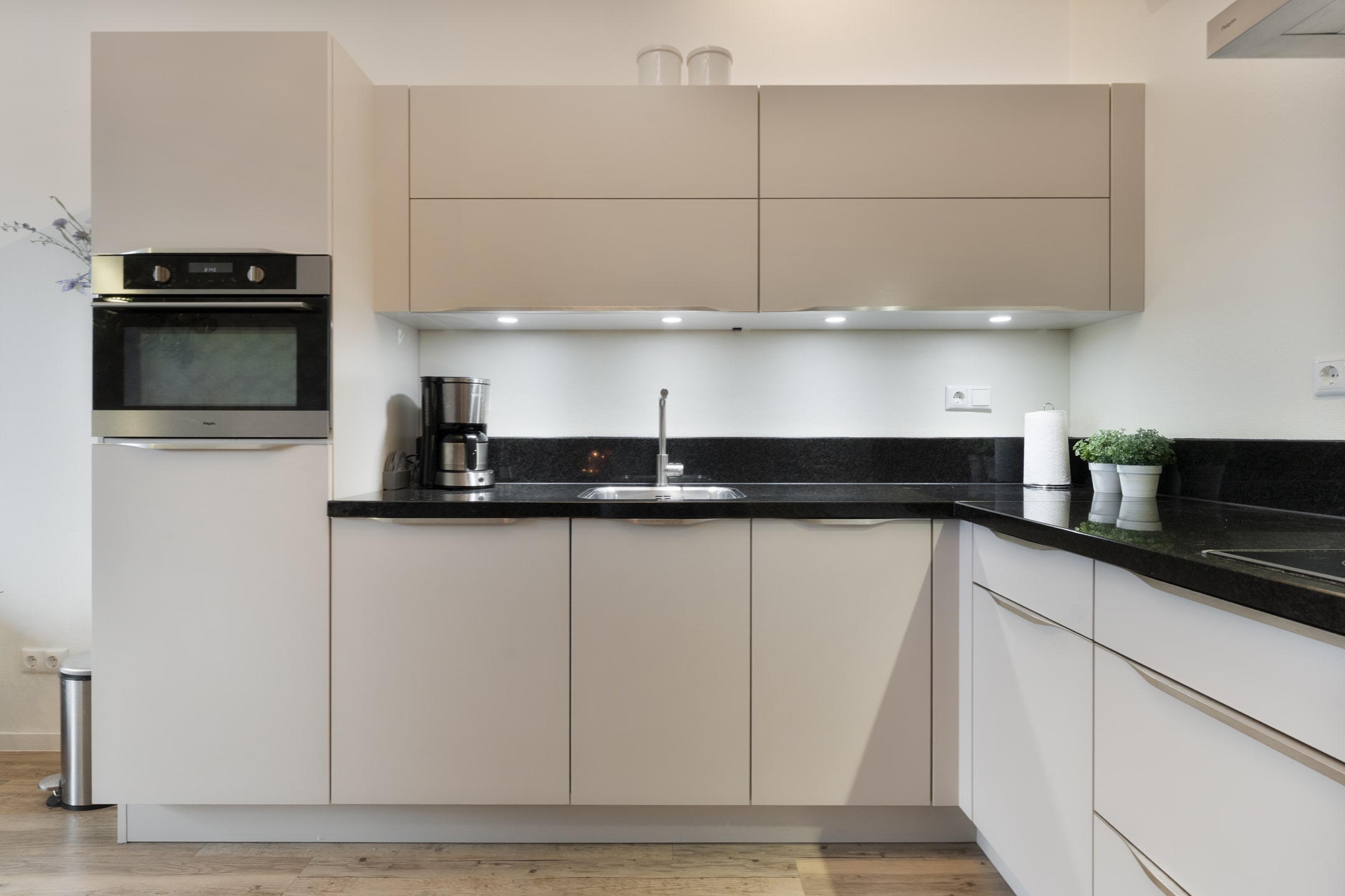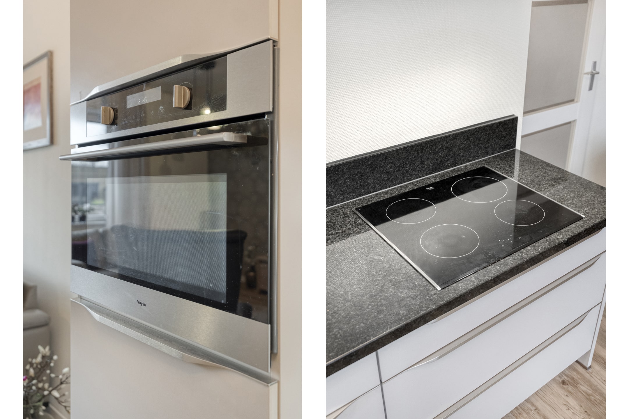 Balkon (buitenruimte), toilet met fontein, meterkast, 2 slaapkamers, bijkeuken, badkamer, woonkamer en een open keuken met inbouwapparatuur.