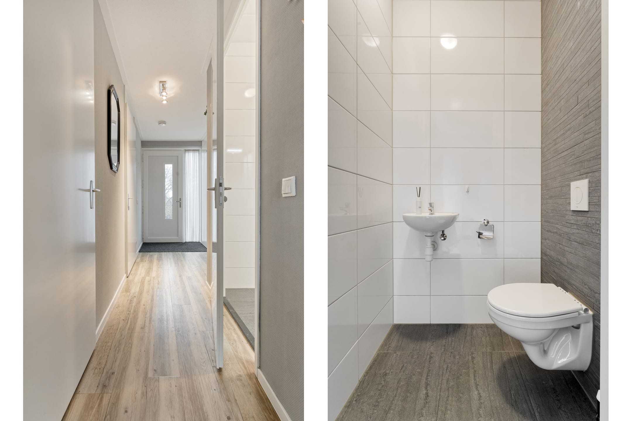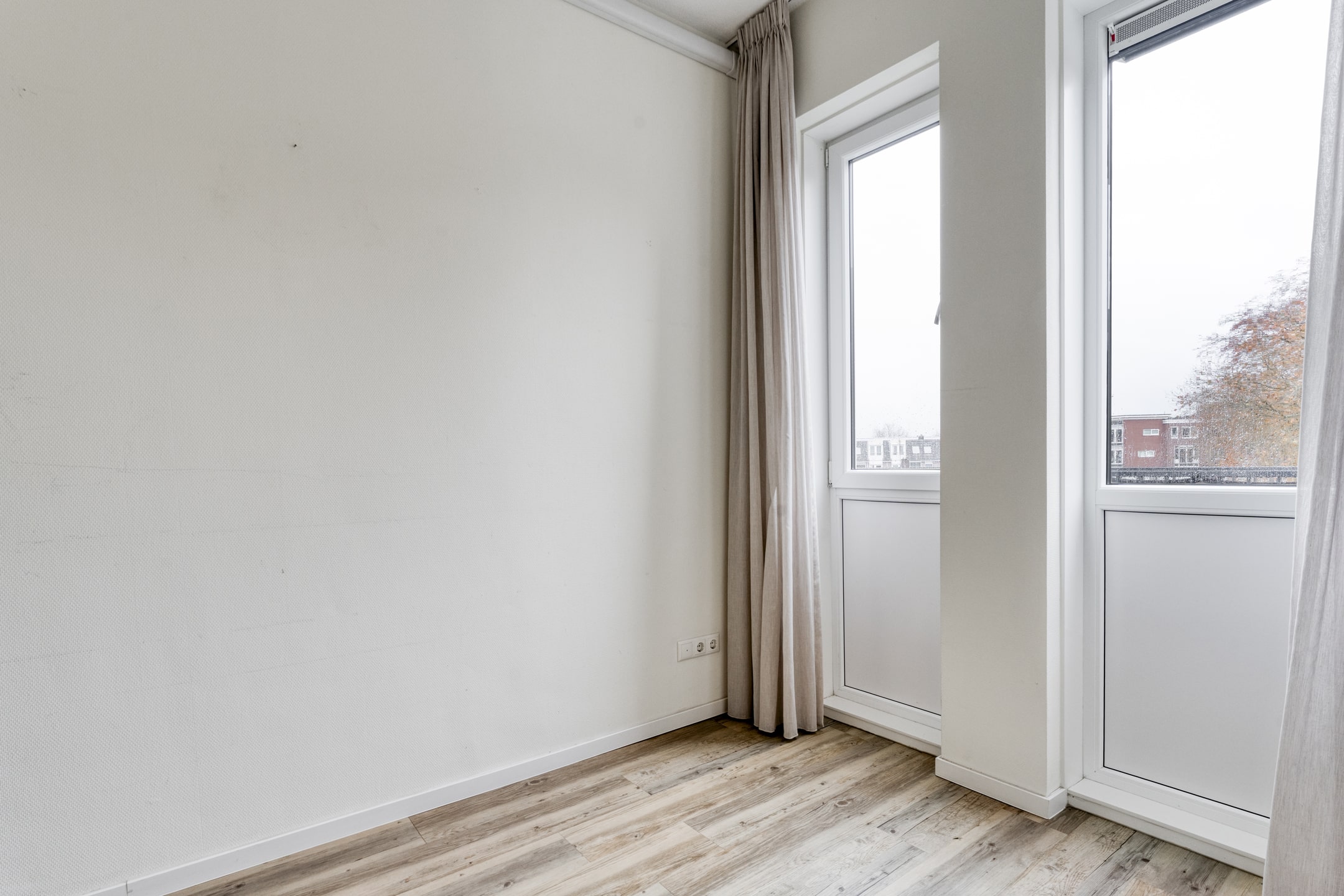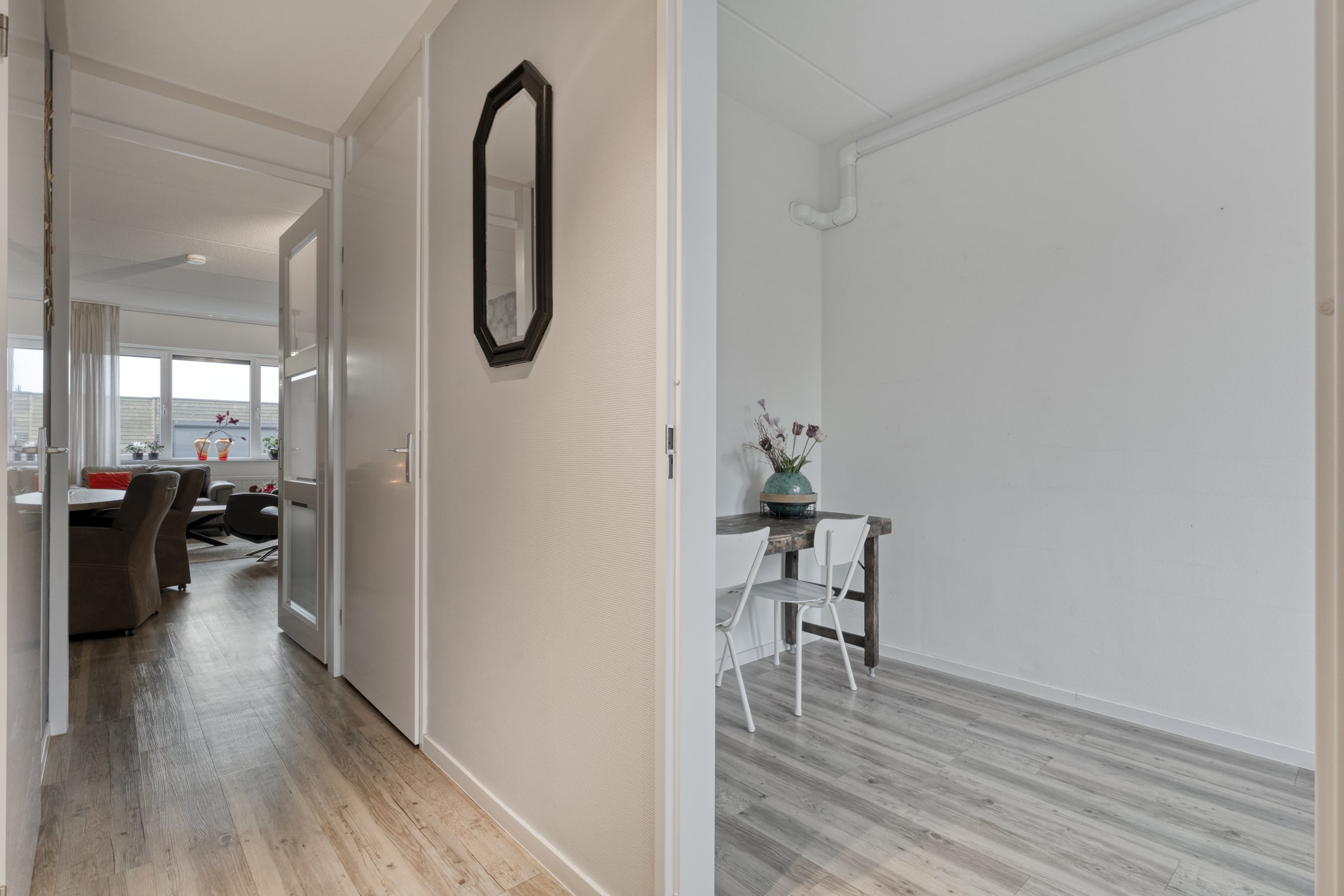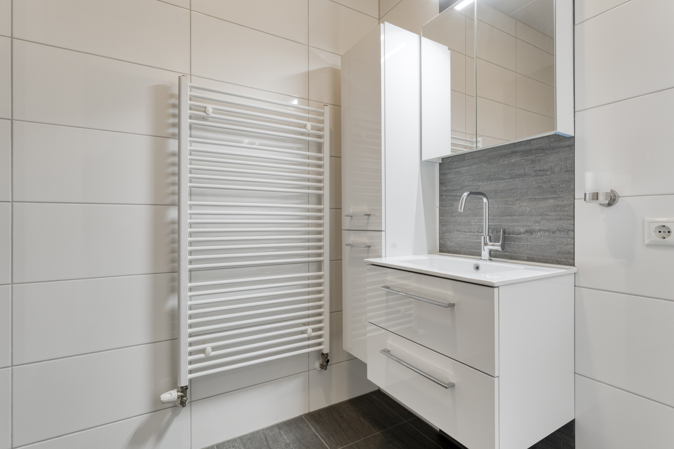 Balkon (buitenruimte), toilet met fontein, meterkast, 2 slaapkamers, bijkeuken, badkamer, woonkamer en een open keuken met inbouwapparatuur.