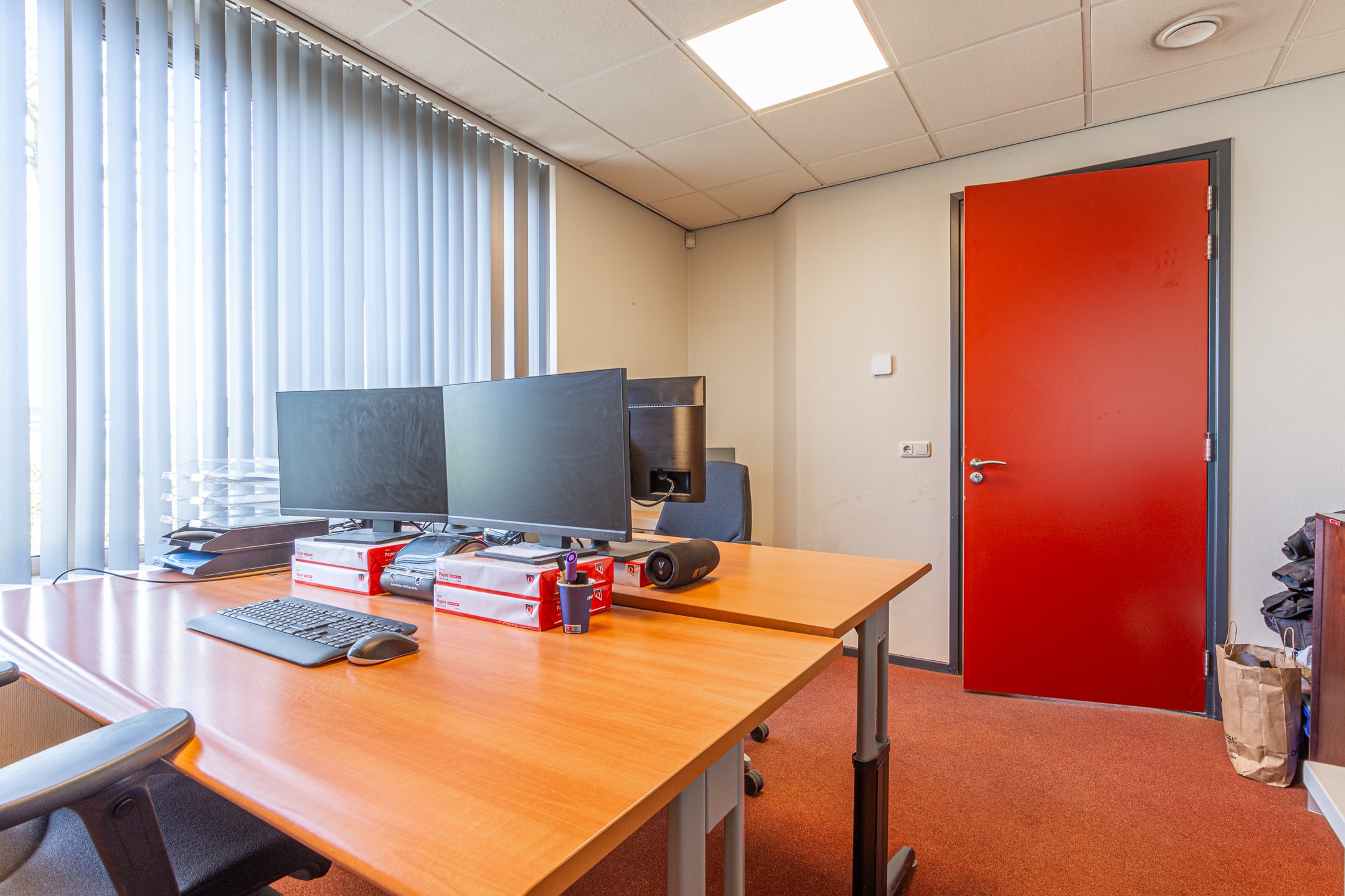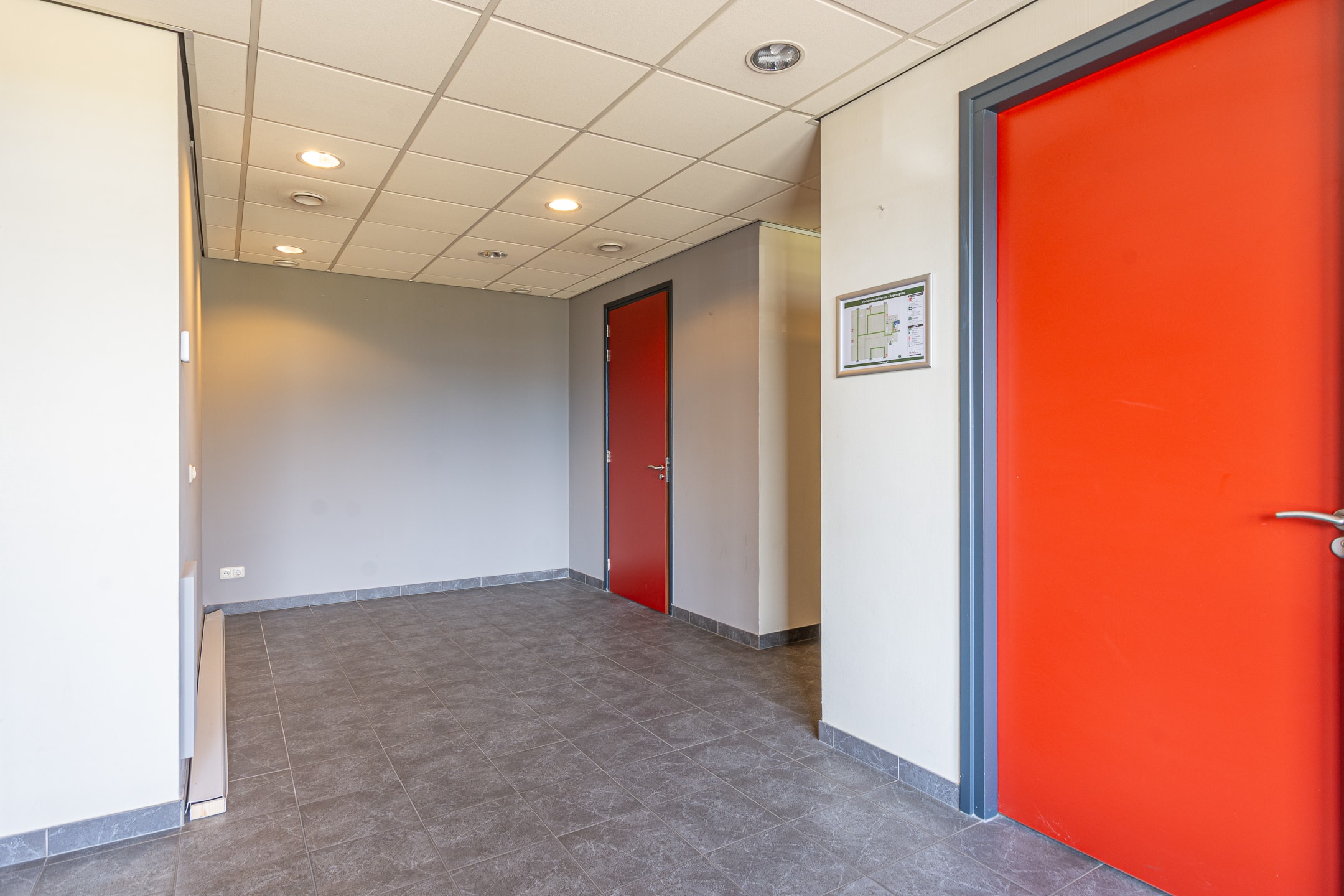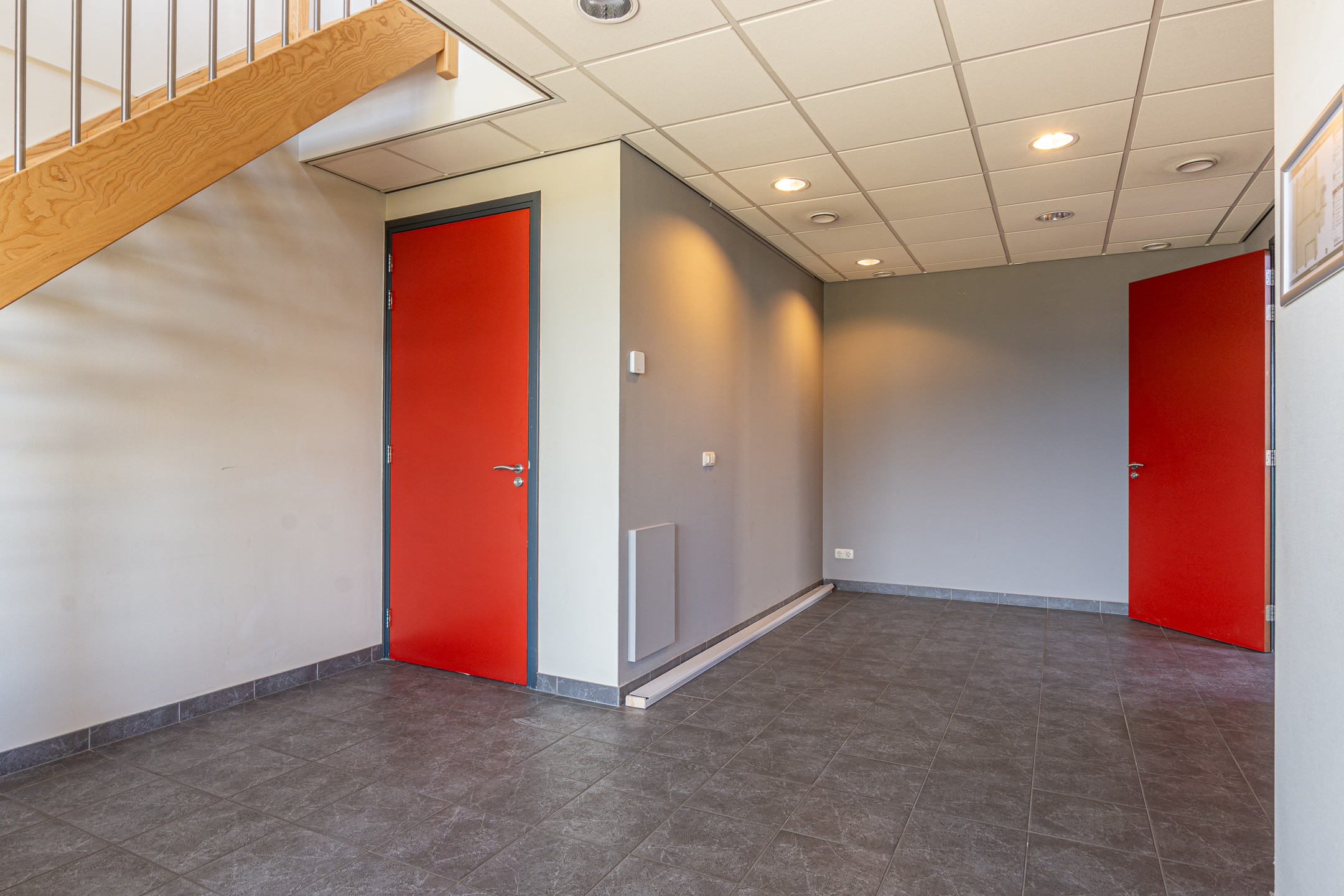 Gezamenlijke entree, kantoorruimte, kantoorruimte met pantry, toilet en doorgang naar bedrijfshal met entresol.