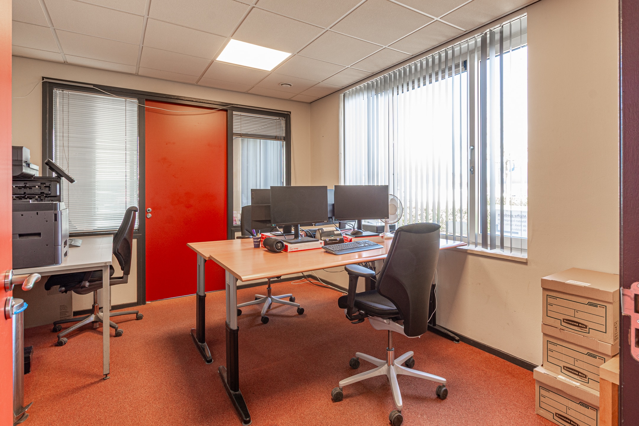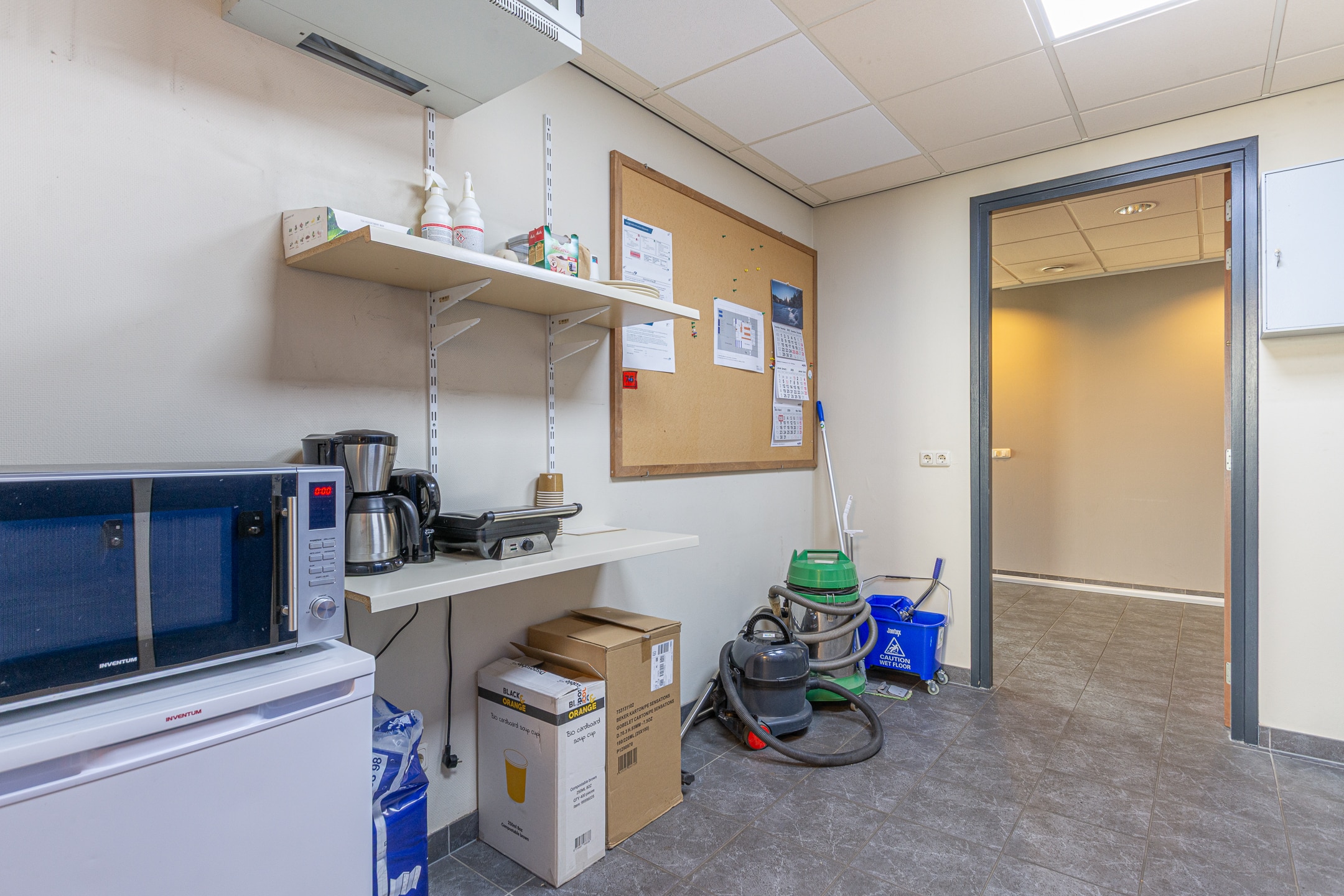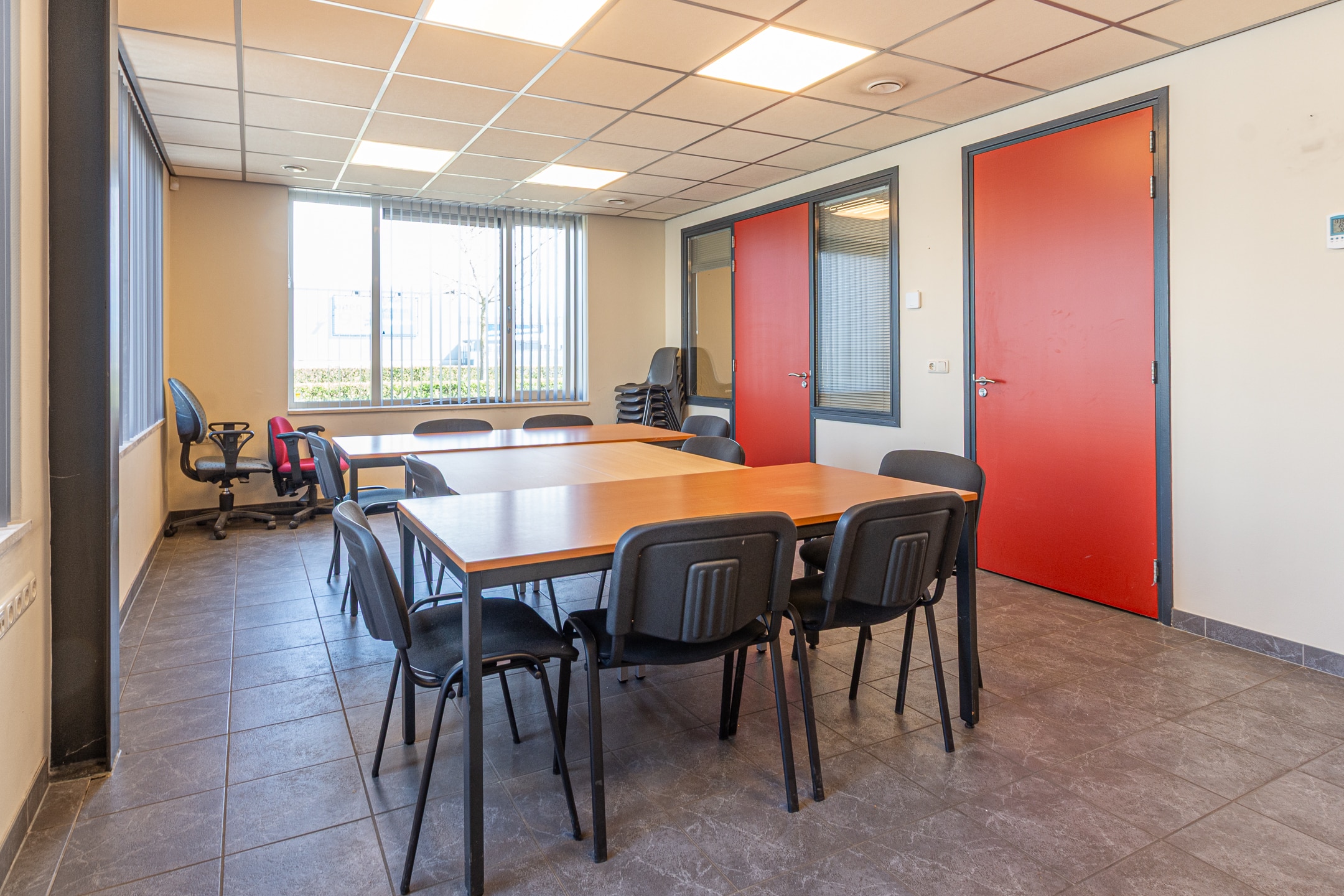Gezamenlijke entree, kantoorruimte, kantoorruimte met pantry, toilet en doorgang naar bedrijfshal met entresol.
