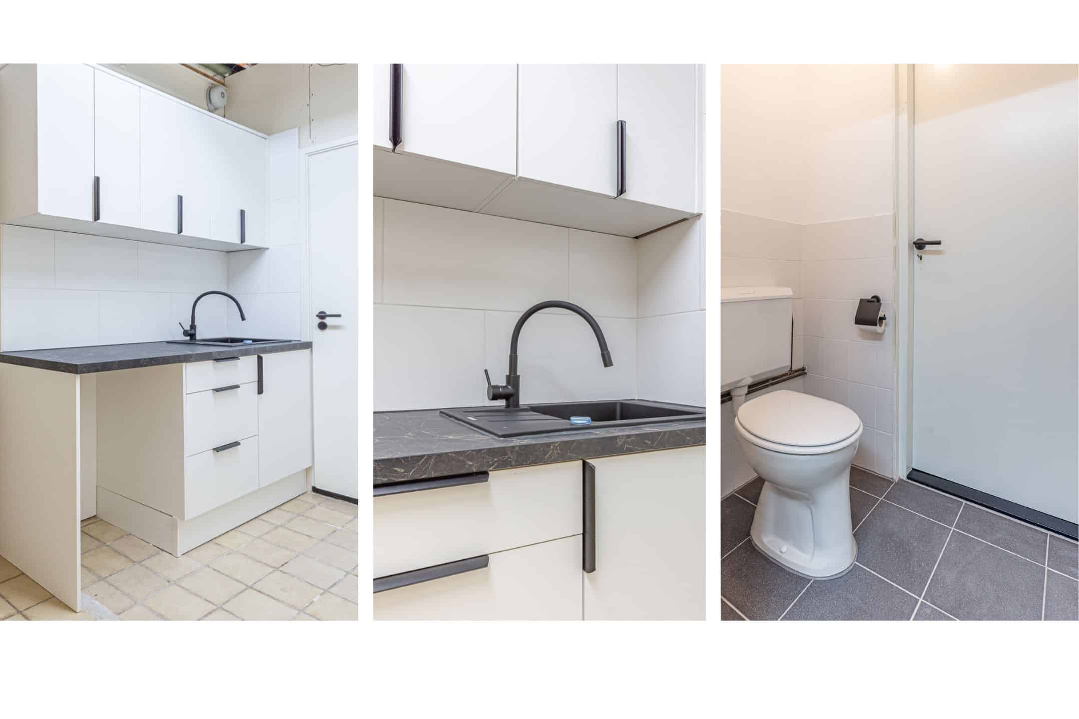 Winkelruimte, pantry, toilet en bergruimte met c.v. installatie.